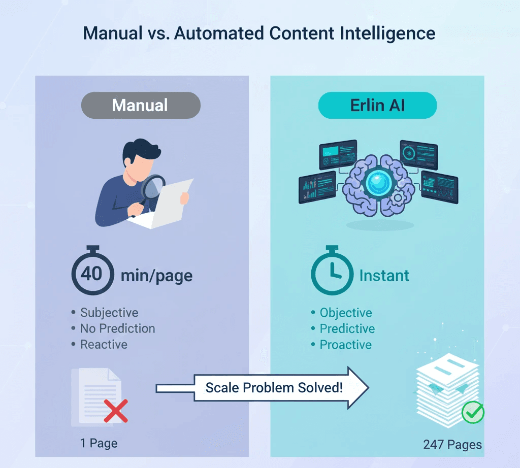 Manual auditing (40+ minutes per page, subjective) doesn't scale, Erlin provides instant site-wide analysis, tracks what actually gets cited, alerts on competitor movements, and prioritizes optimization by business impact