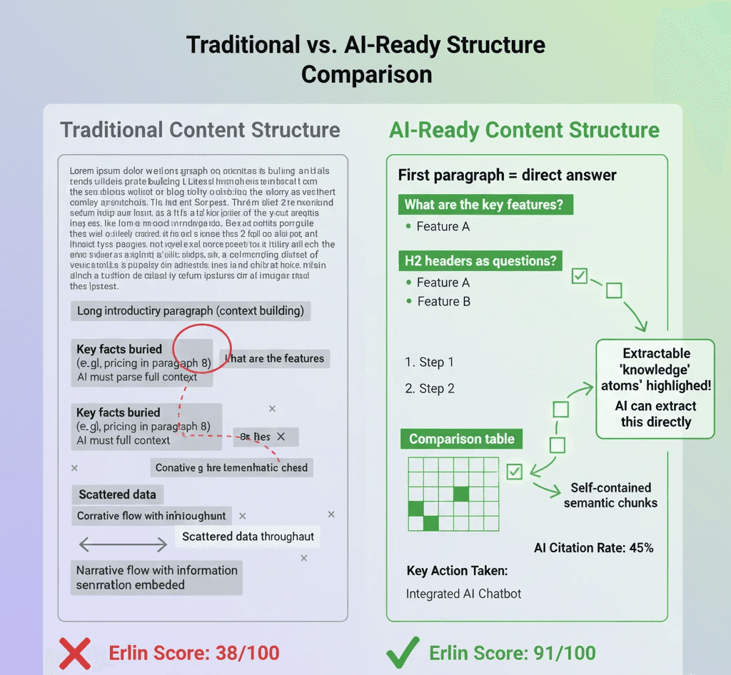 Traditional content structure fails in AI search. Learn the 7 elements of AI-ready content and how Erlin scores your content for AI extractability.