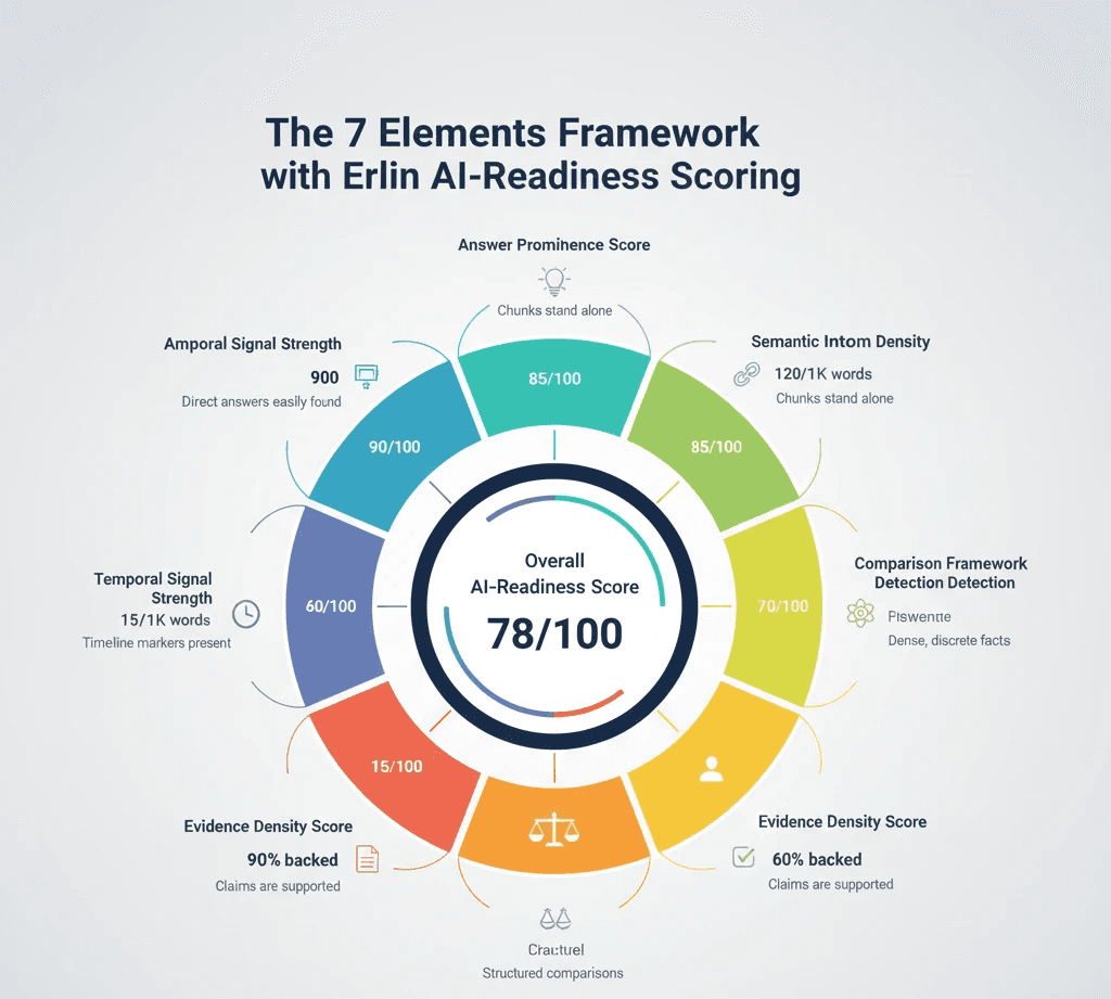AI-ready content requires 7 structural elements: definition-first paragraphs, semantic chunking, extractable knowledge atoms (10-15 per 1,000 words), comparison frameworks, evidence integration, entity-rich language, and temporal specificity, each measured by specific Erlin metrics