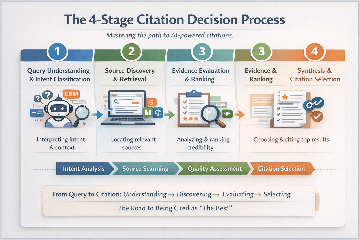 Every AI citation follows a predictable four-stage process. Mastering these stages is the key to consistent visibility.