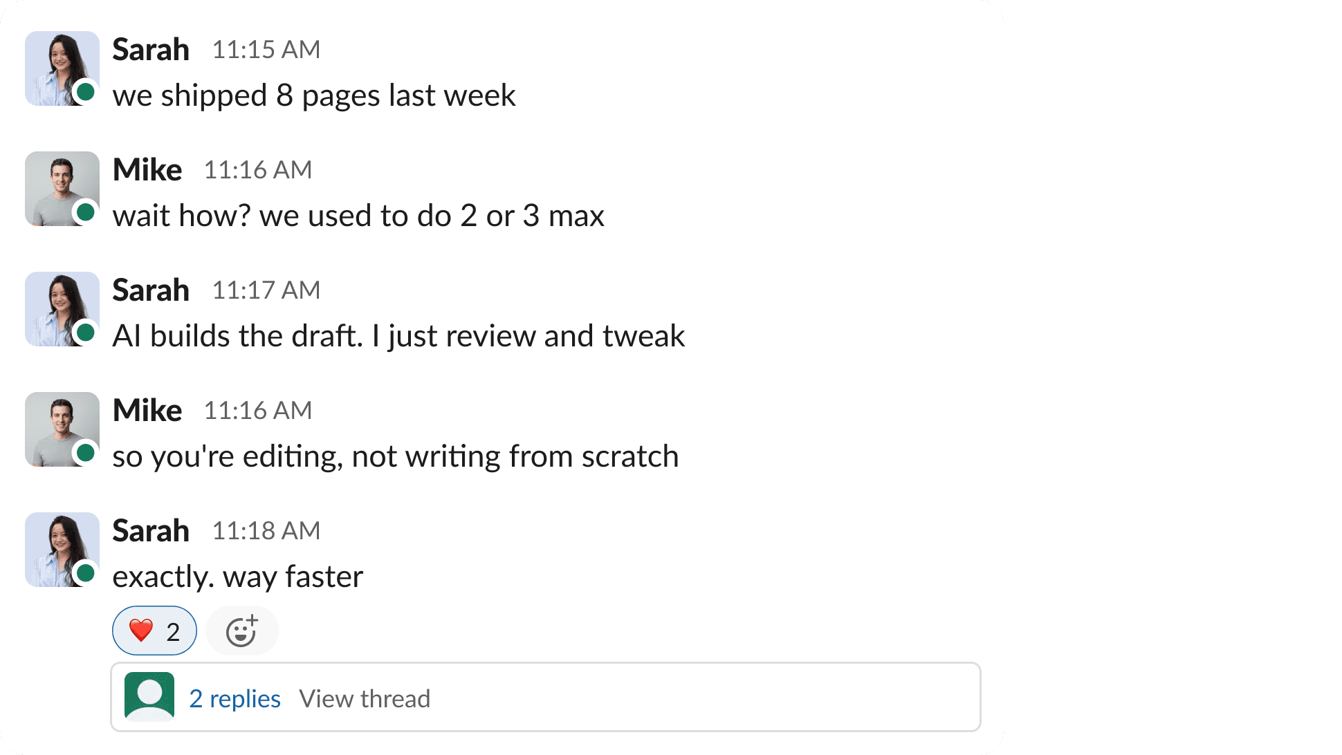 "We shipped 8 pages last week compared to our usual 2 or 3. AI builds the first draft and I just review and tweak. I'm editing instead of writing from scratch. Way faster and our content velocity is up 3x."
