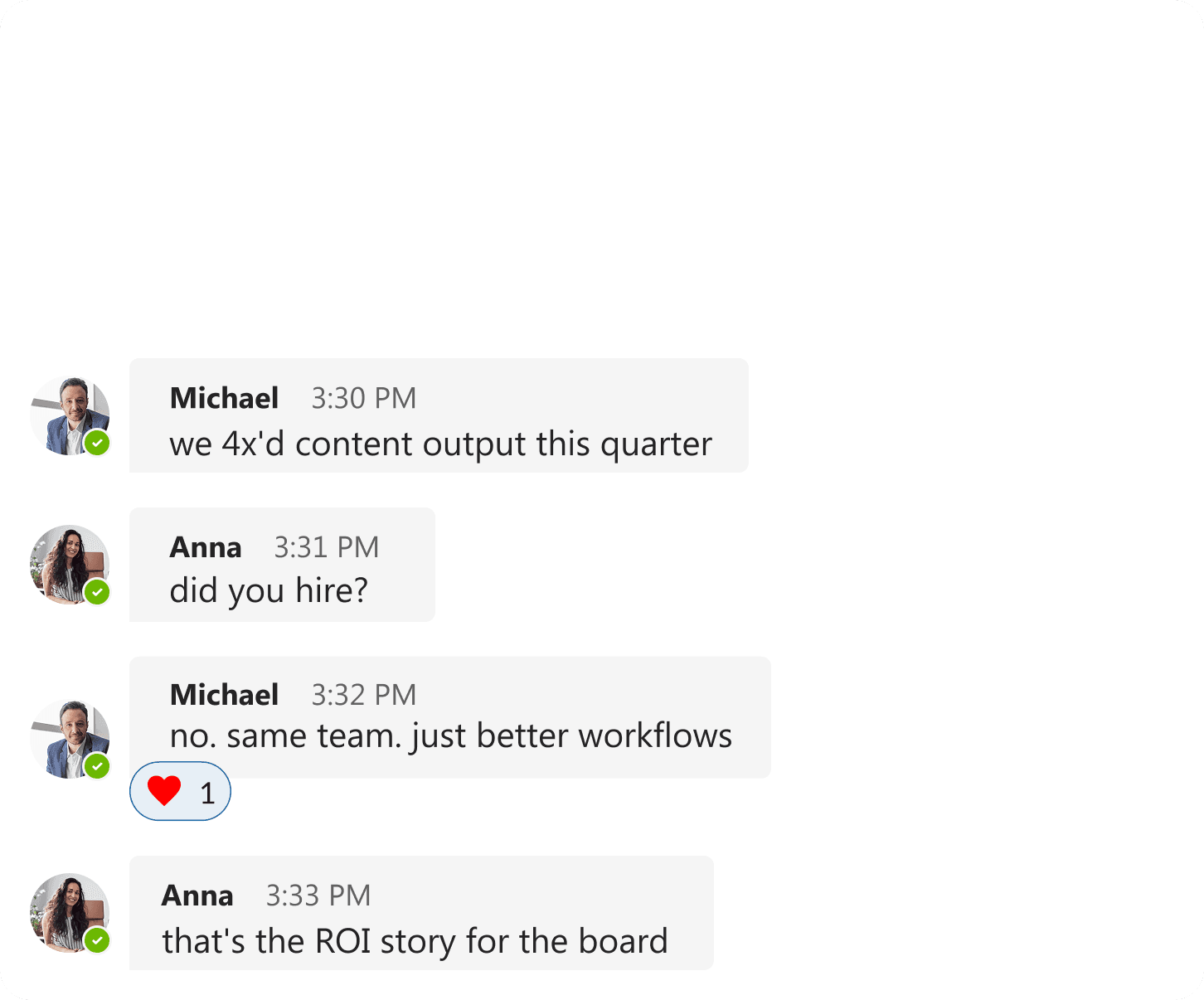 "We 4x our content output this quarter with the same team. Better workflows made everyone more productive. That's the ROI story the board wants to hear. More output, better results, higher efficiency."