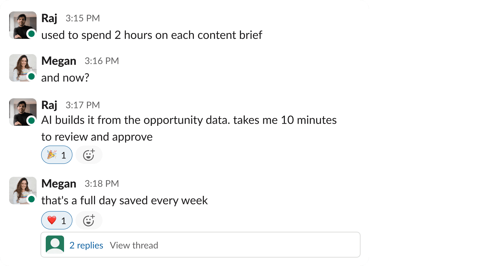 "I used to spend 2 hours on each content brief. Now it builds from the opportunity data and takes me 10 minutes to review and approve. That's a full day saved every week that I can spend on strategy."