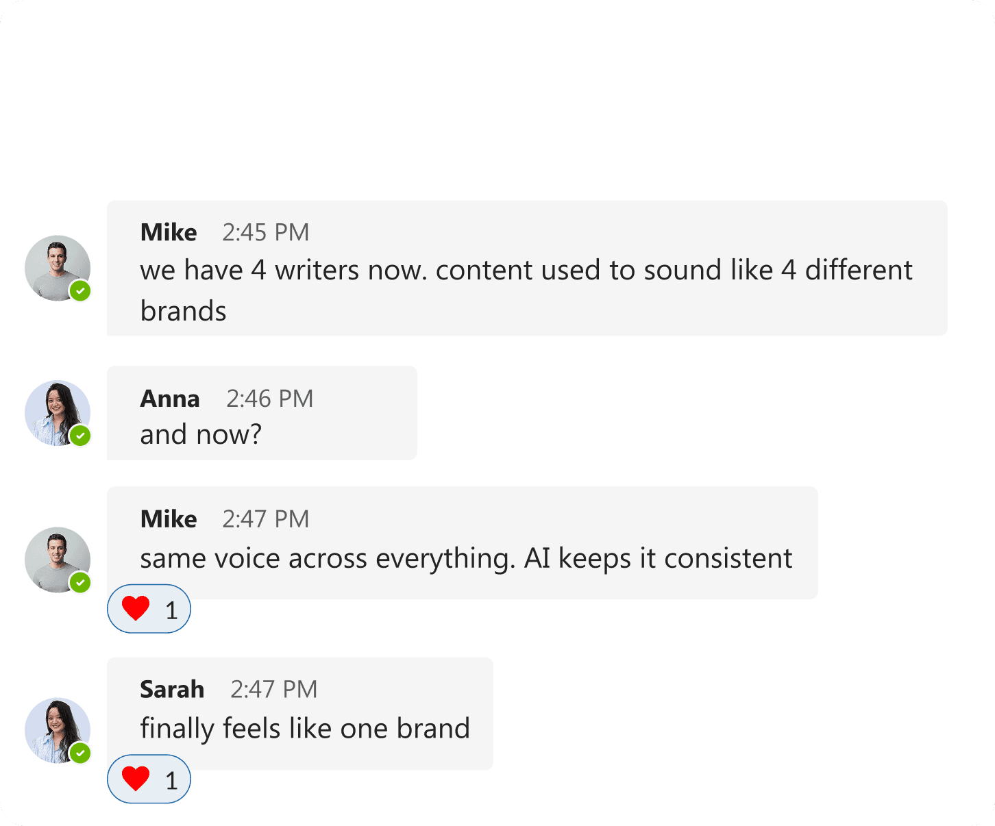 "We have 4 writers now and content used to sound like 4 different brands. Now it's the same voice across everything. AI keeps it consistent. Finally feels like one brand."