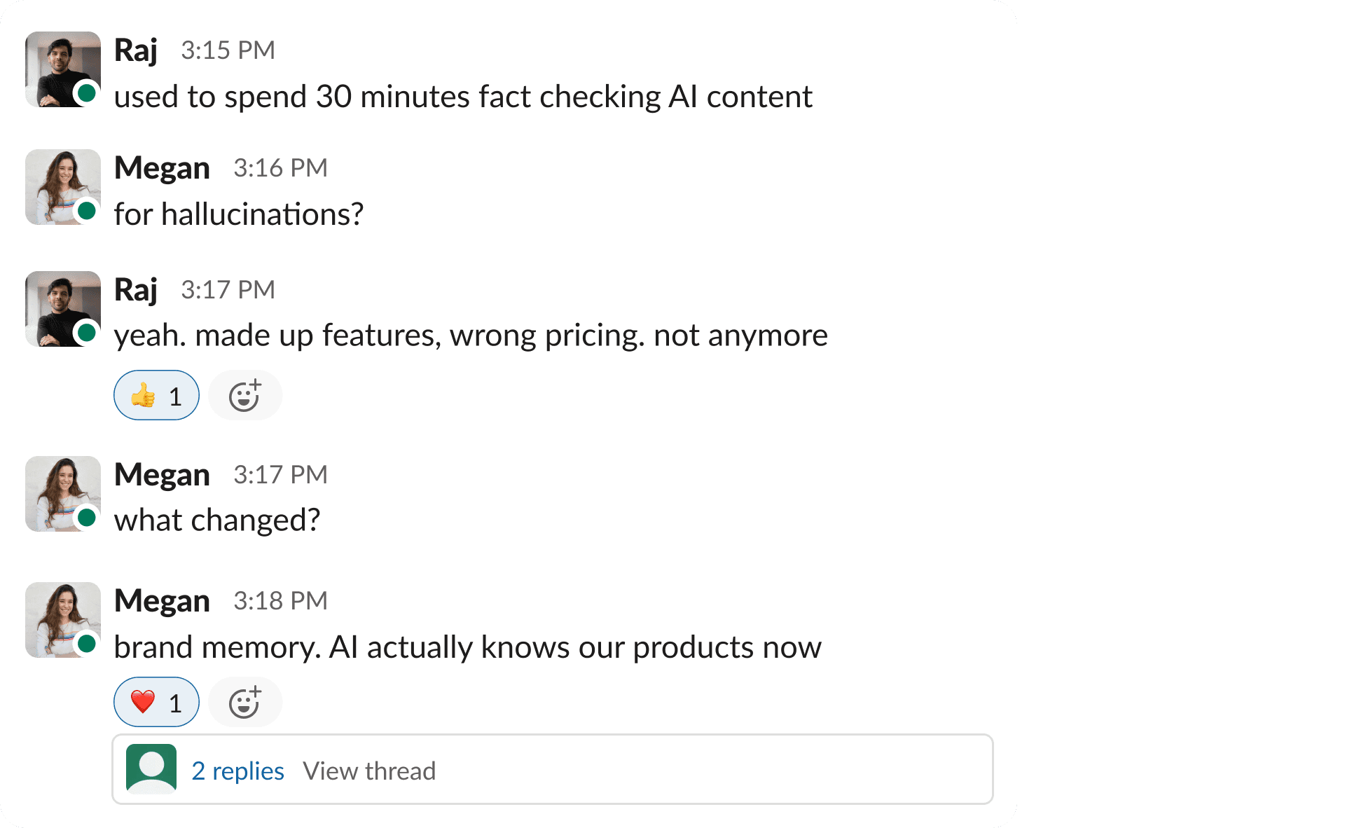"I used to spend 30 minutes fact checking AI content for made up features and wrong pricing. Not anymore. Brand memory means it actually knows our products now. No more hallucinations to fix."