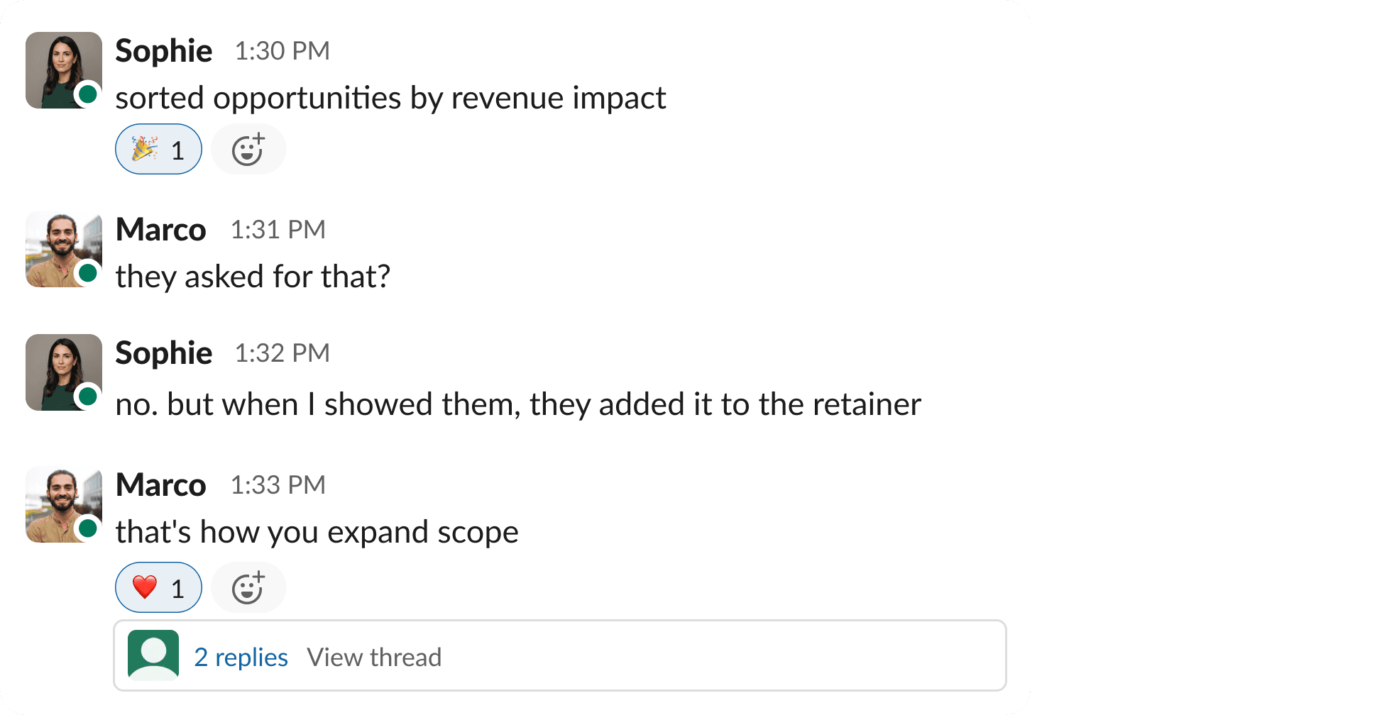 "Leadership wanted a prioritized content plan for Q2. I exported opportunities sorted by impact and tied them to revenue goals. Done in minutes. This used to be a 2 week project with spreadsheets and guesswork."