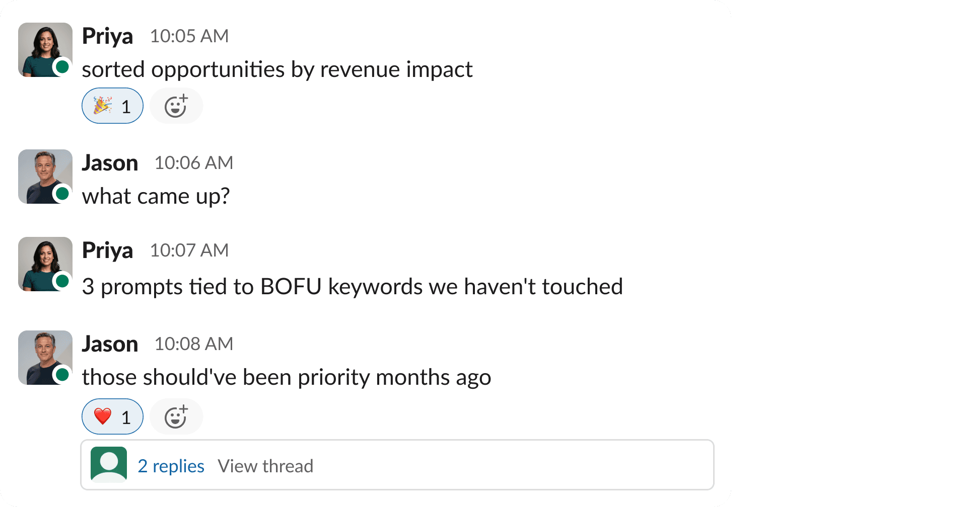 "When I sorted opportunities by revenue impact, 3 prompts tied to bottom of funnel keywords came up that we hadn't touched. These should have been priority months ago. Now we focus on what actually drives revenue instead of guessing."
