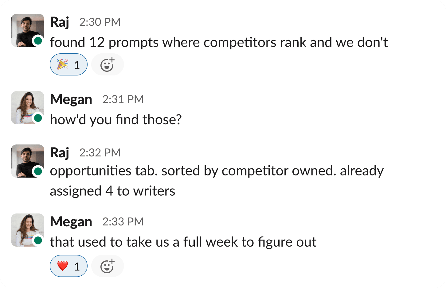 "Found 12 prompts where competitors rank and we don't. Used the opportunities tab to sort by competitor owned and assigned 4 to writers right away. This used to take us a full week to figure out manually."
