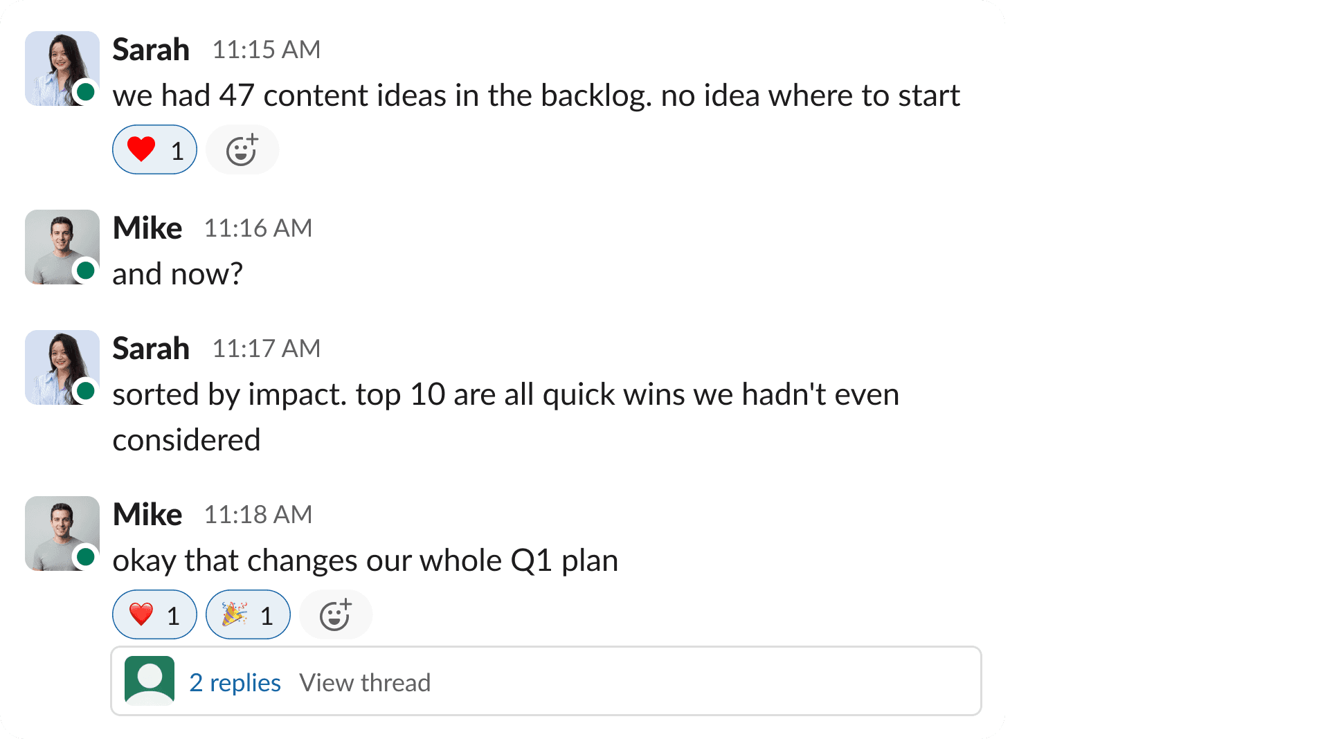 "We had 47 content ideas in our backlog with no clear priority. Now they're sorted by impact and the top 10 are all quick wins we hadn't considered. Changed our whole Q1 plan. We know exactly what to work on first."