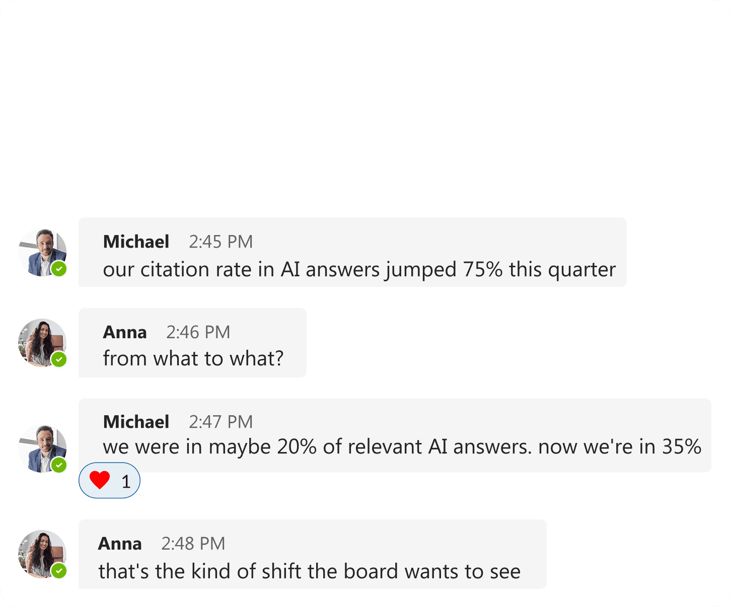 "Our citation rate in AI answers jumped 75% this quarter. We went from appearing in 20% of relevant AI answers to 35%. That's the kind of market position shift the board wants to see. We can actually measure our AI visibility now."