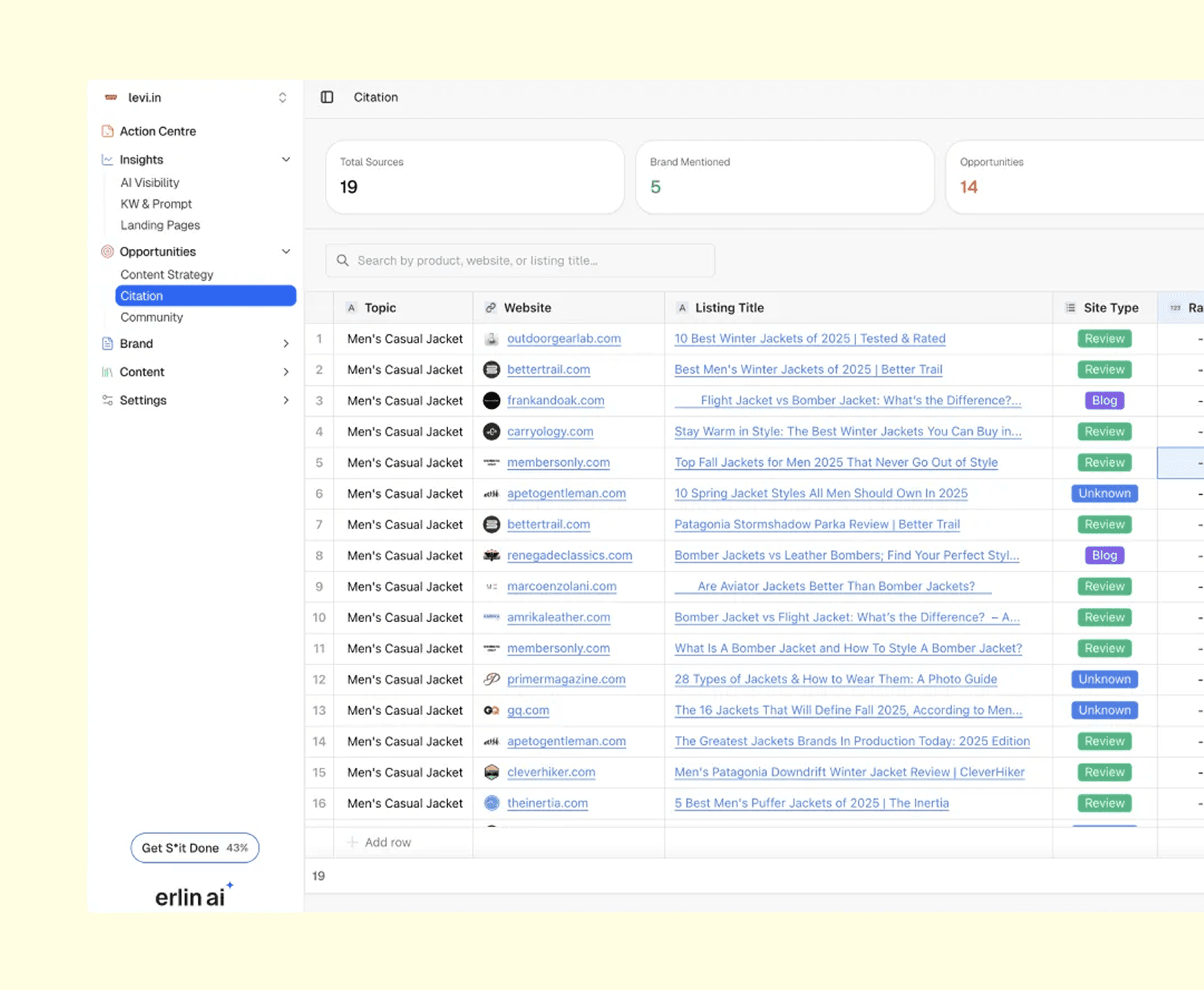 Track which blogs, publications, and review sites AI is citing, and whether your brand shows up.