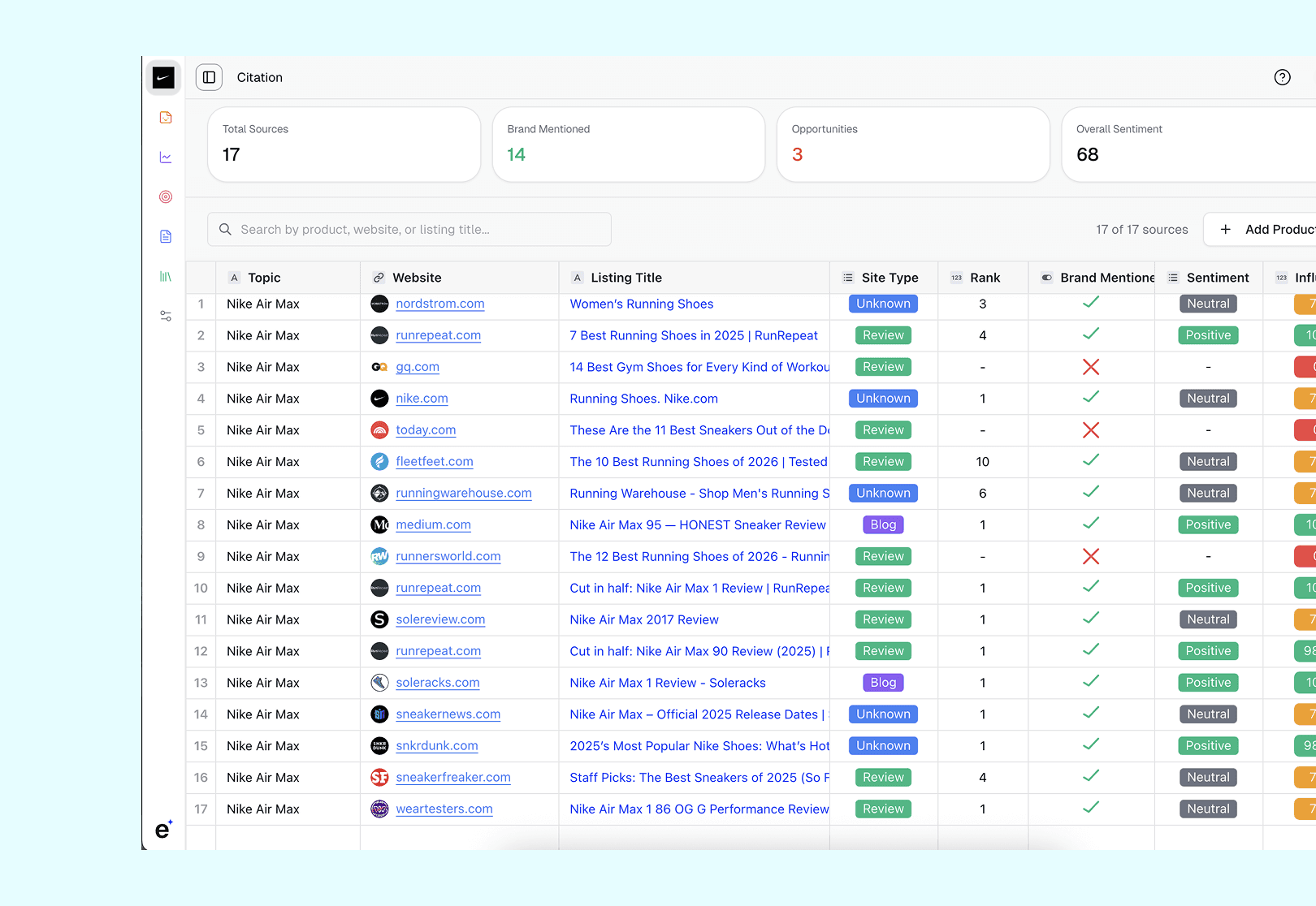 Identify which publishers, communities, and platforms AI platforms trust most when generating answers in your category.