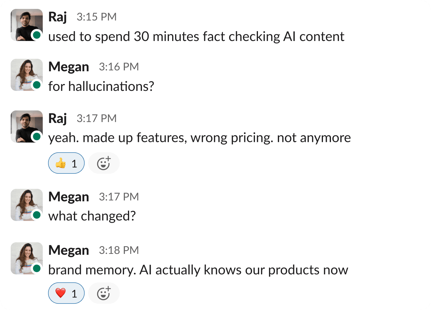 "I used to spend 30 minutes fact checking AI content for made up features and wrong pricing. Not anymore. Brand memory means it actually knows our products now. No more hallucinations to fix."