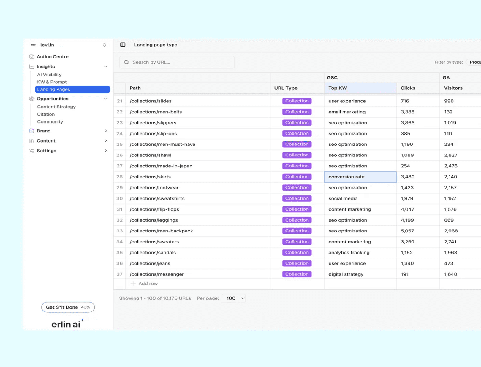 See every landing page with traffic and conversion data from Google Search and Analytics.