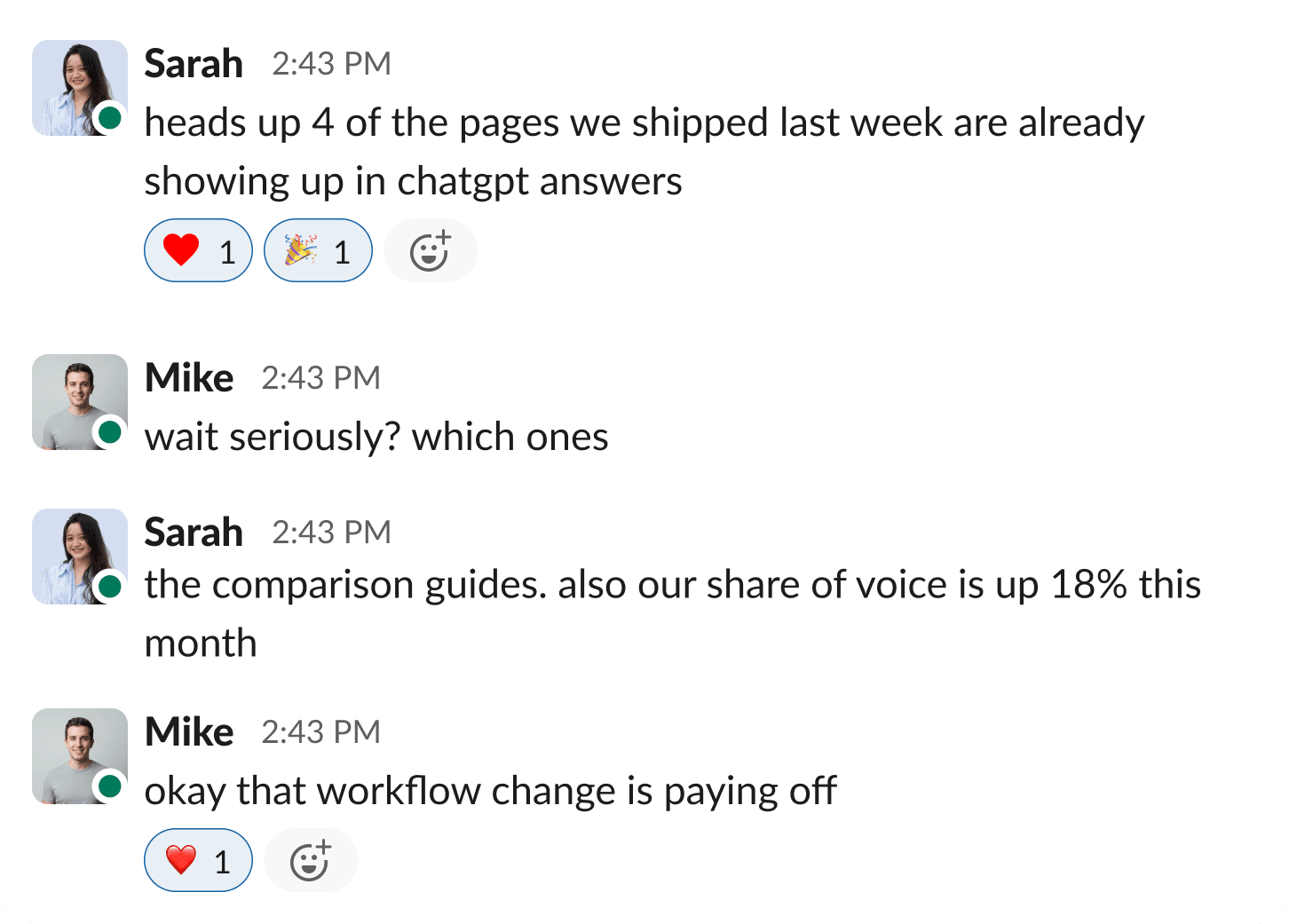 With faster workflows, we're shipping more content and Erlin lets us track exactly which pages are getting cited in ChatGPT. Our share of voice is up 18% this month. We can actually prove our content strategy is working now."
