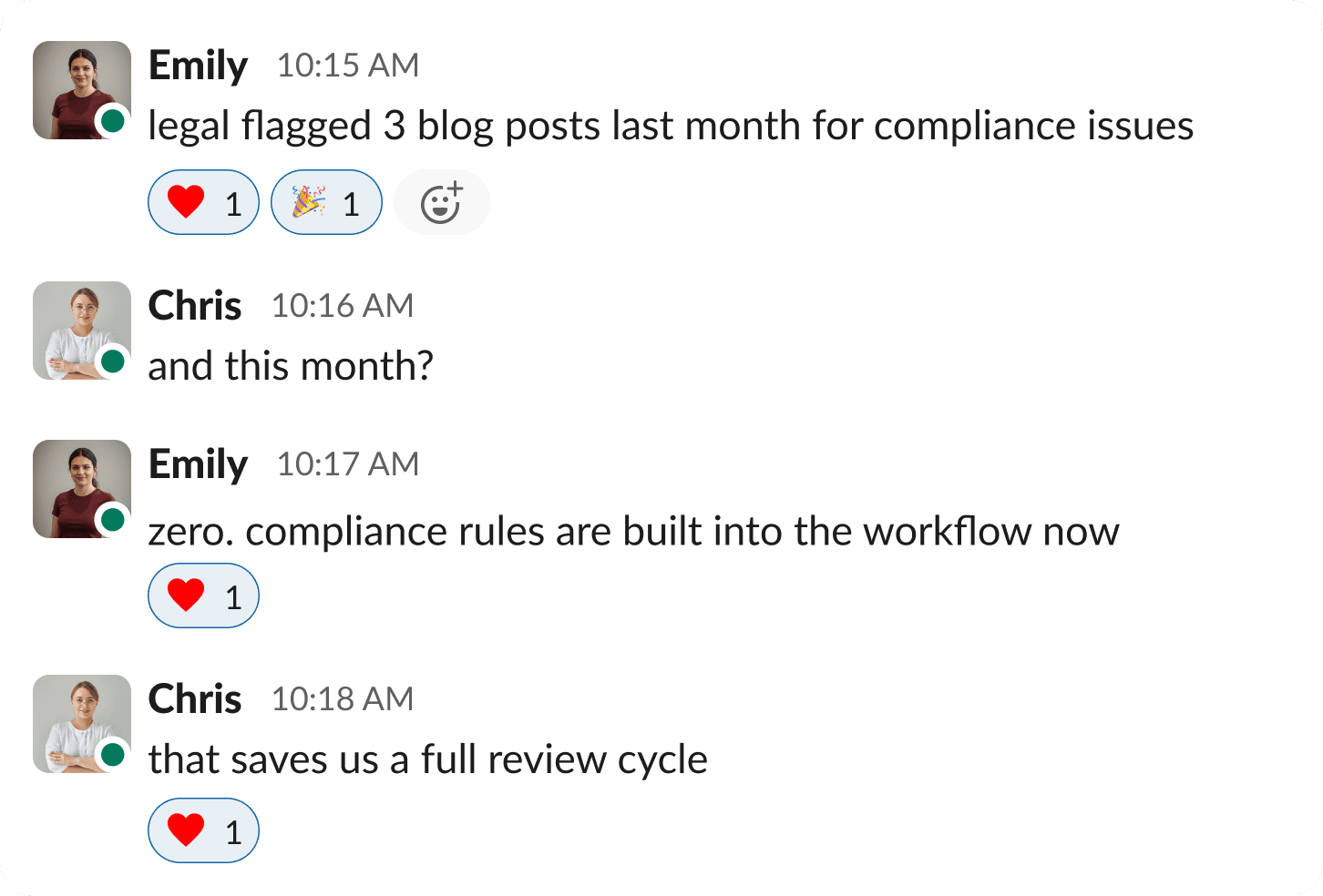 "Legal flagged 3 blog posts last month for compliance issues. This month, zero. Compliance rules are built into the workflow now. Saves us a full review cycle and legal is happy."