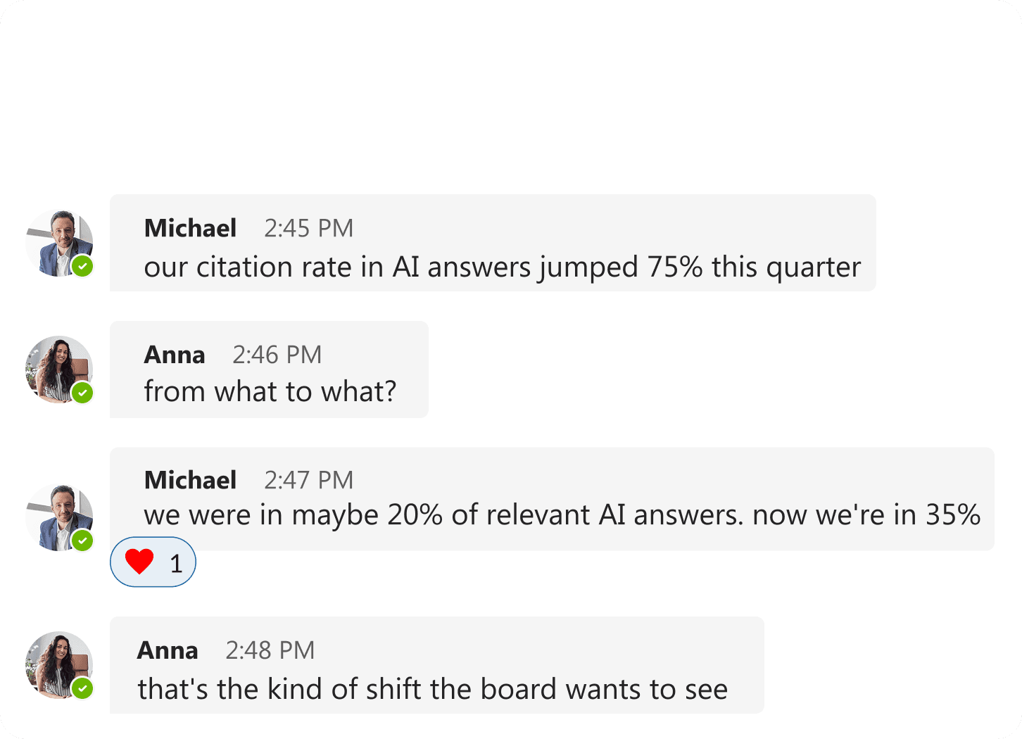 "Our citation rate in AI answers jumped 75% this quarter. We went from appearing in 20% of relevant AI answers to 35%. That's the kind of market position shift the board wants to see. We can actually measure our AI visibility now."