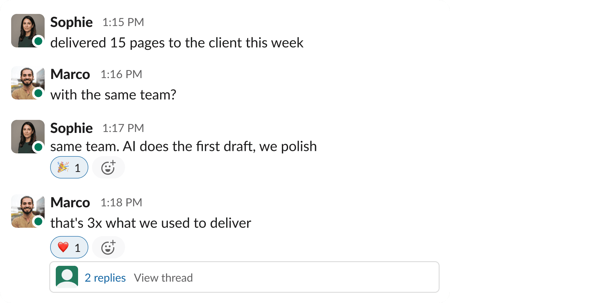 "We delivered 15 pages to a client this week with the same team. AI does the first draft and we polish it. That's 3x what we used to deliver. We can take on more clients without hiring."