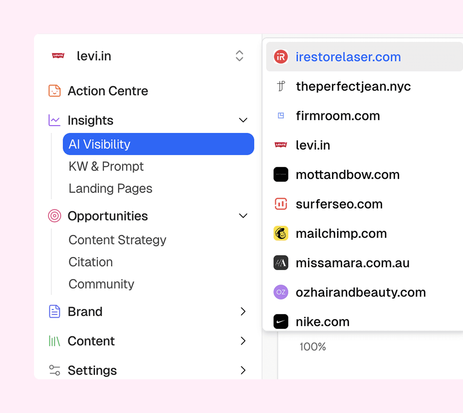 Discover citation gaps, competitive prompts, and content opportunities for client brands in minutes. See which Reddit threads, blog roundups, and review sites drive AI recommendations in their category. Agencies report same-day upsell signatures when showing clients insights they didn't ask for. Find what competitors are missing and expand client scope with data.