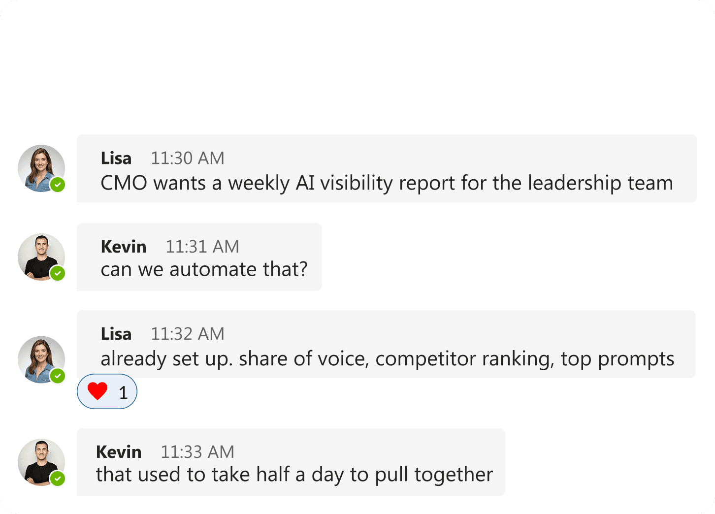 "Our CMO wanted weekly AI visibility reports for leadership. We set up automated reporting with share of voice, competitor ranking, and top prompts. Used to take me half a day to pull this together manually. Now it's ready every Monday."