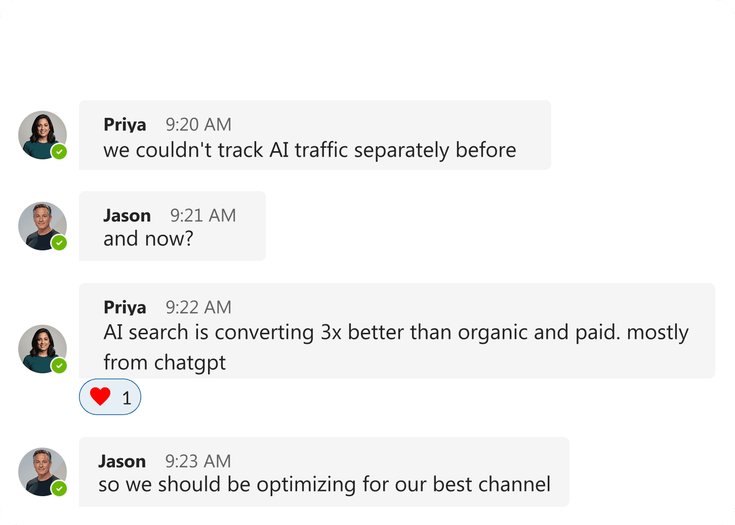"Our growth team couldn't track AI traffic separately from other sources. We knew organic was converting well compared to paid, but when we started tracking AI search, it's converting 3x better than both. Now we can optimize our best performing channel."